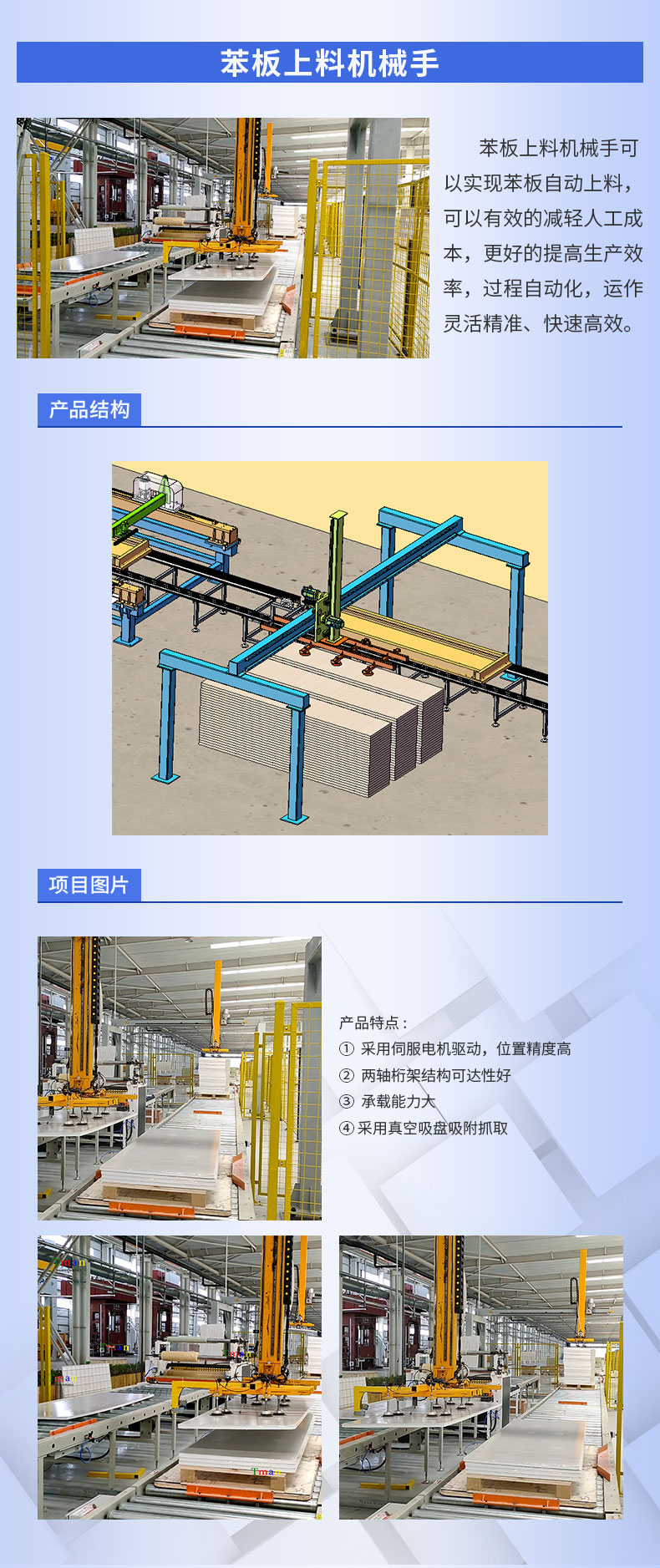 苯板上料機械手可以實現苯板自動上料,可以有效的減輕人工成本,更好的提高生產效率,過程自動化,運作靈活精準、快速高效。