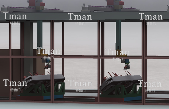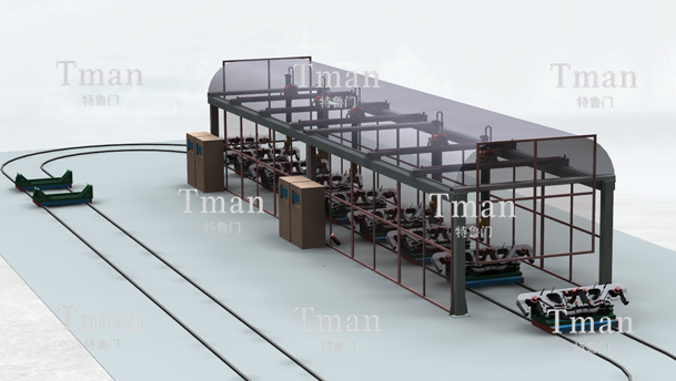 為提高效率,切割與打磨分別采用2臺行走五軸機構(gòu)分別進行加工,工件置于移動小車之上,搬運小車自帶驅(qū)動在地軌上搬運行走,加工件工最大直徑尺寸是2.8米X0.7米,重0.75噸。
