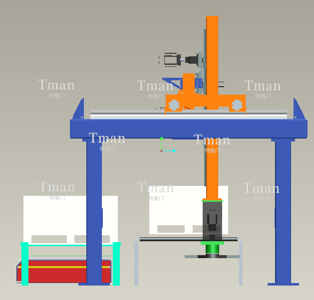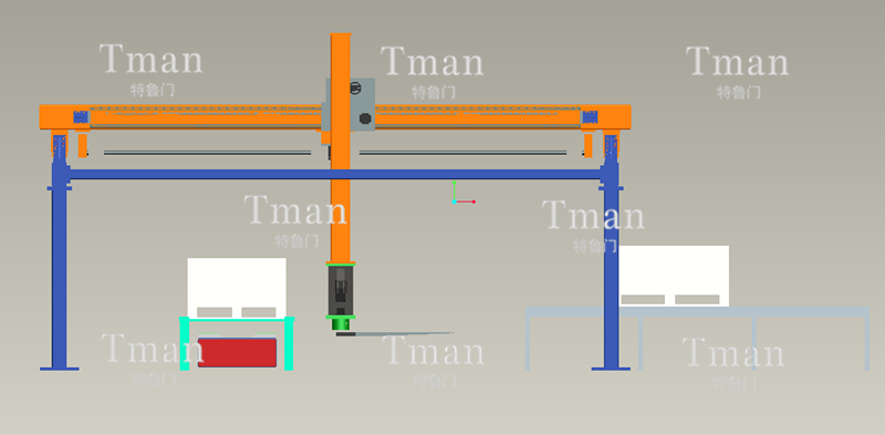 ③整機(jī)具有X、Y、Z三坐標(biāo)垂直軸及Z軸旋轉(zhuǎn)軸。起重Y軸采用雙邊齒輪,集中驅(qū)動(dòng)。