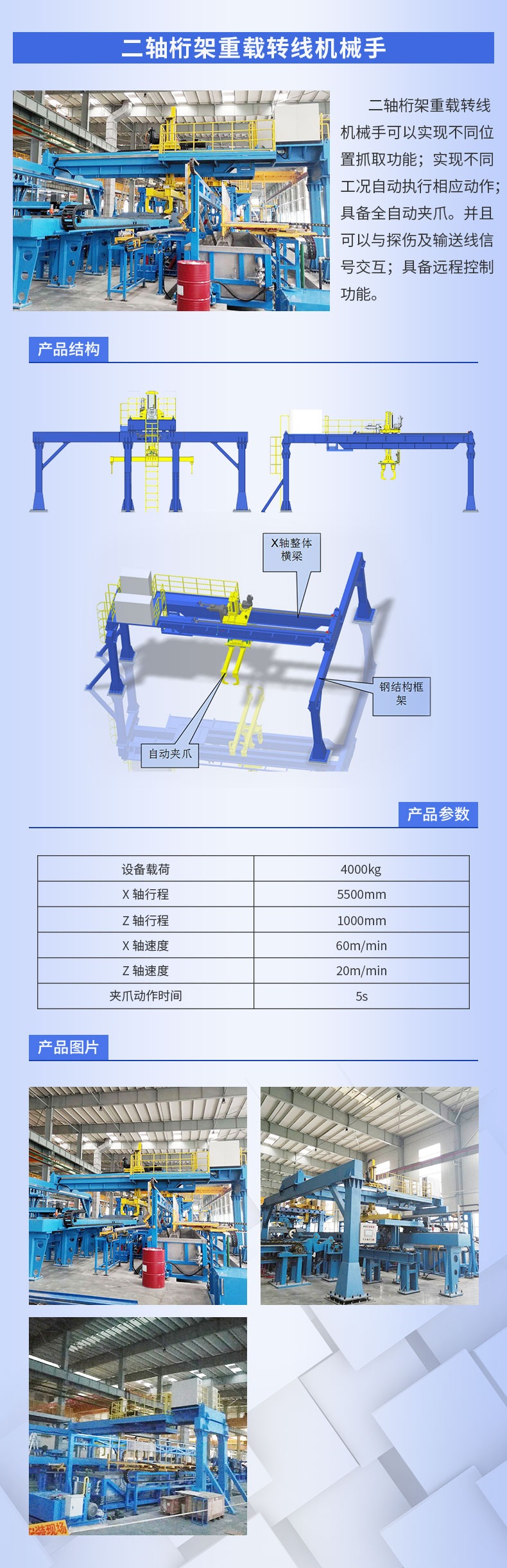 關(guān)鍵詞:重載桁架機械手 重載機械手、自動抓取、搬運機械手